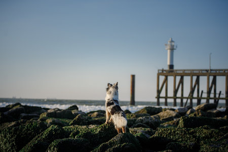 dog at sea. marble Australian Shepherd stands on a stone and looks at the water