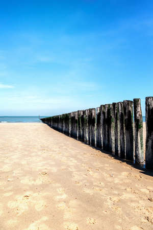 wooden groynes at the beach in Zeeland, Holland