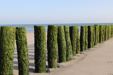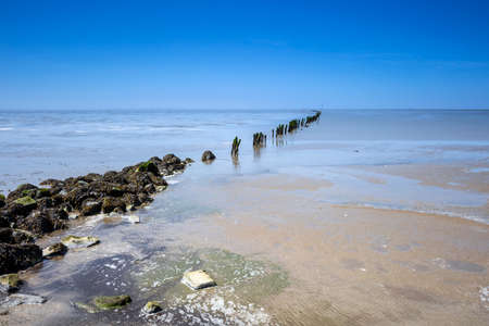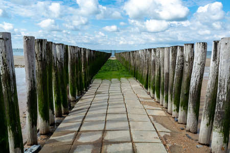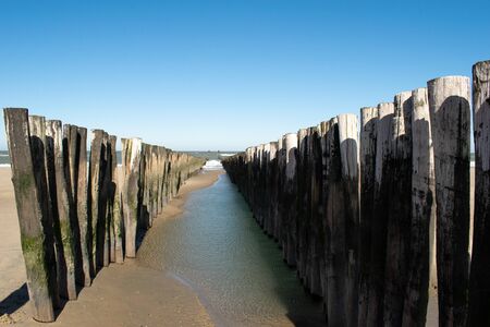 Pier with wooden posts at the North Sea coast in the province of Zeeland, The Netherlands