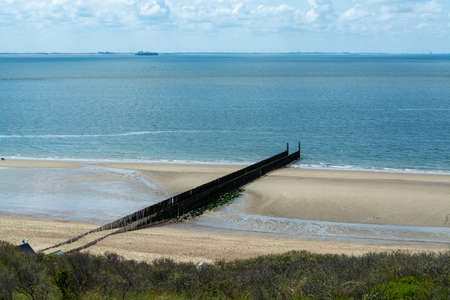 View on wooden poles at white sandy North sea beach near Zoutelande, Zeeland, Netherlands during low tide