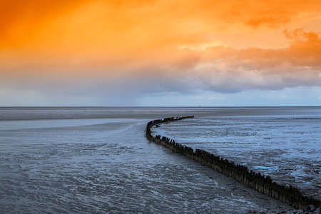 Beautiful view of the sea and breakwaters at low tide in Wierum in the Netherlands. The background is a blue sky with dramatic clouds.
