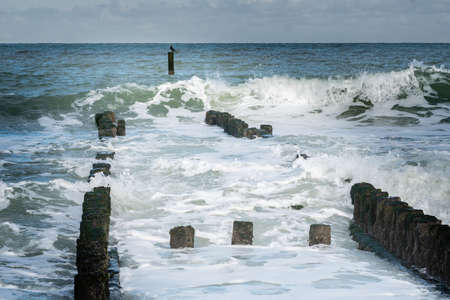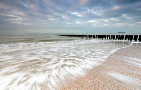 breakwaters in waves on the beach at the north sea in Domburg Holland