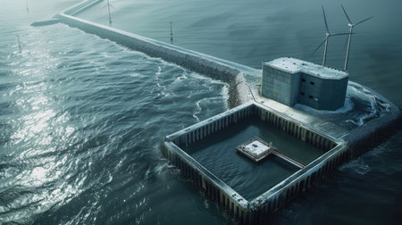 Generative AI, Offshore electricity substation, solar and wind turbine facility, ocean landscape