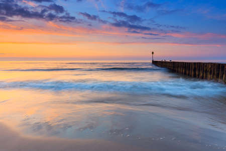Sunrise over the Baltic sea, Poland. Photographer of breakwater in warm light of sun.
