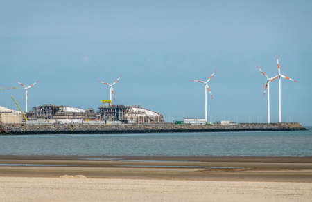 Zeebrugge, Flanders, Belgium - June 18, 2019: Closeup of LNG terminal in port of Zeebrugge under blue sky as seen from beach in Knokke-Heist. Windmills on dock.