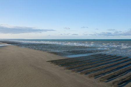 Long rows of oyster farms create geometric lines across the wet sand at Utah Beach, meeting gentle waves under a clear blue sky. The open shoreline and rhythmic repetition evoke a sense of tranquility and order.