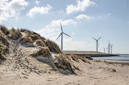 Sandy dune at the beach of Rockanje on the island of Voorne, The Netherlands with wind turbines on Haringvliet dam in the background on a sunny day in early spring