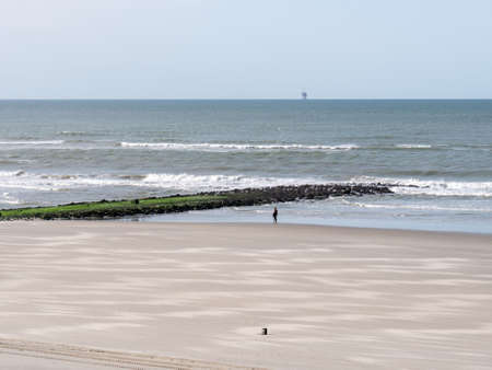 Woman walking waterline near breakwater, beach of North Sea coast of West Frisian island Vlieland, Friesland, Netherlands