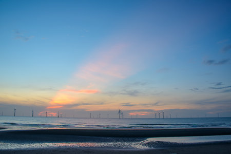 Fans of wind turbines spin over the sparkling sea. Dynamic clouds at sunset. An offshore wind farm off the northwest coast of Taiwan. One of green power.