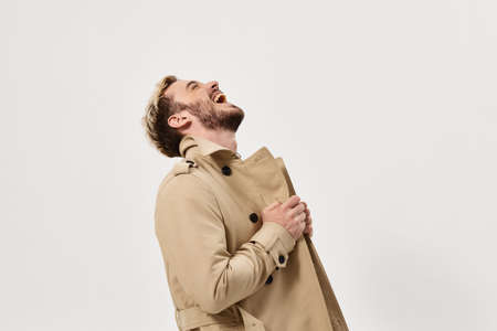 Cheerful man in coat laughing studio modern lifestyle lifestyle