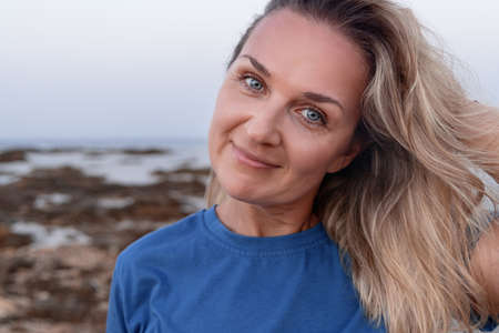 Smiling fair haired middle aged woman wearing blue t-shirt at sunset near the sea. Head shot
