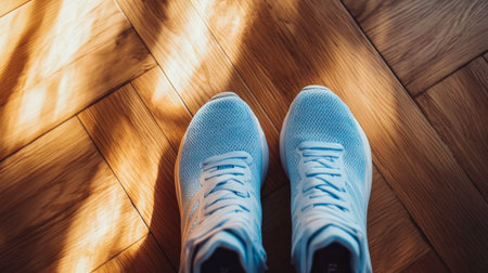 A pair of light blue running shoes on a wooden floor, ready for a morning jog or workout session.