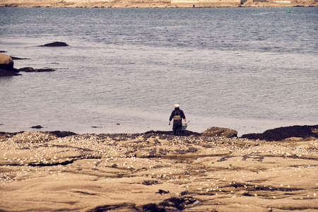 Solitude Amidst Overcast Serenity: Lonely Figure on the Rocky Coast