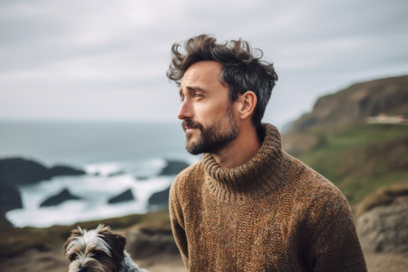 Handsome young man with his dog on the beach, wearing a warm sweater