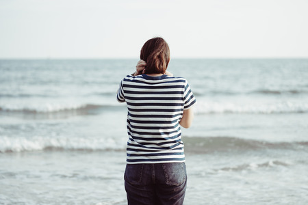 Asian young woman standing facing the sea. Feeling really lonely, heartbroken sea like a nursery of clearing the mind. The concept of liberation travel alone.
