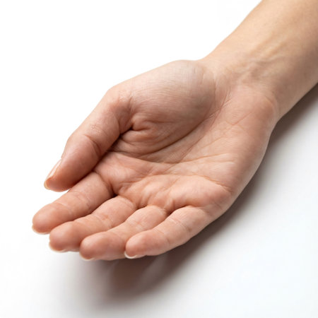A close-up shot of an open human hand with the palm facing upwards, isolated against a clean white background. The hand is relaxed, showing the natural lines and contours of the skin.