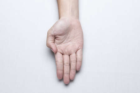 Hand gestures, to wave Hello. Greeting someone. light grey background