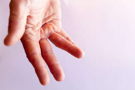 Hand of an man with Dupuytren contracture disease, against bright background, isolated