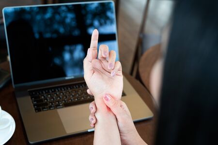 Arthritis person, finger woman ache from working in office. Concept office syndrome hand pain from occupational disease, woman having wrist pain from using laptop computer, wrist pain.