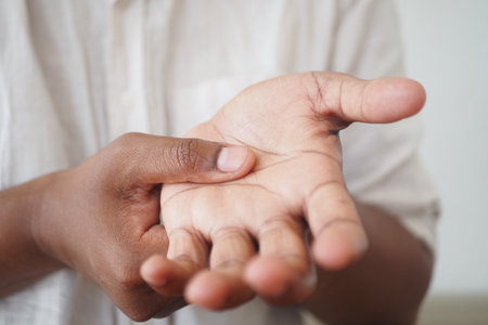 Painful palmar aspect of Asian old man. Concept of compartment syndrome, cellulitis and hand muscles pain.