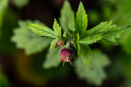 Woodland strawberry leaf on a green blurred background. Fragaria vesca.