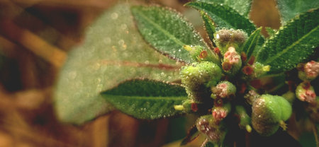 Young buds of cotoneaster lucidus close up on background of rich green leaves in shadow with copy space. Little beetle anther on small beautiful flowers in macro. Insect on buds.