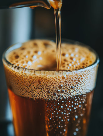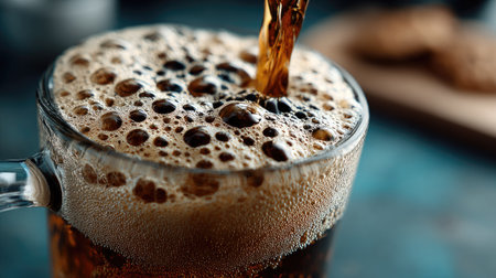 A close-up view of a dark beverage being poured into a glass, showcasing bubbles and foam. Surrounding snacks create a warm and inviting atmosphere.
