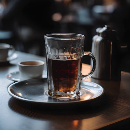 A cup of hot, black tea in a glass cup on a gray ceramic countertop.