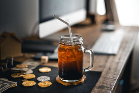 A glass of cold coffee and ice served with cream in small jar. Cold summer drink on a wooden table