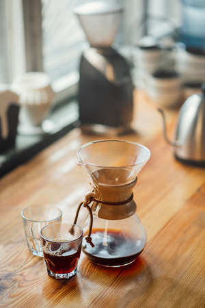 coffee brewed according to an alternative method on a table in a glass faceted glass and a transparent jug