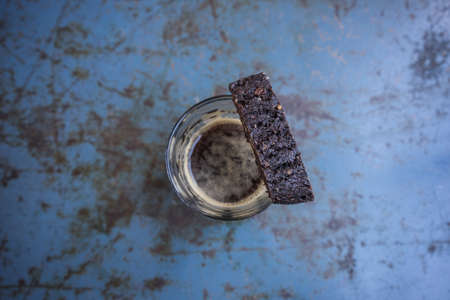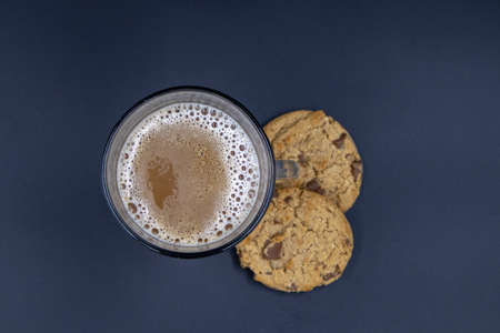 A top view shot of a beverage in a glass and two chocolate chip cookies against a blue background