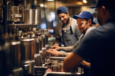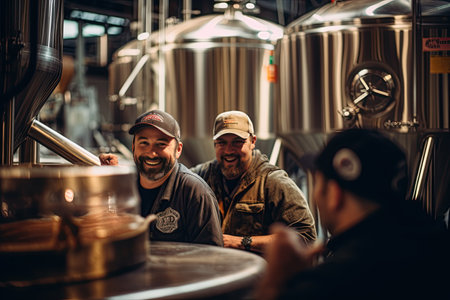 Amidst the lively ambiance of a brewery, employees passionately craft beer. Generated with AI