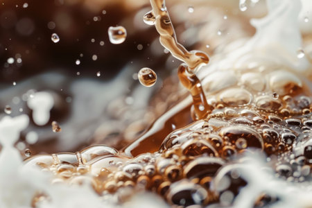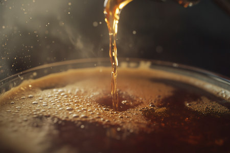 Close-up of a dark, hot drink being poured, creating bubbles and steam.