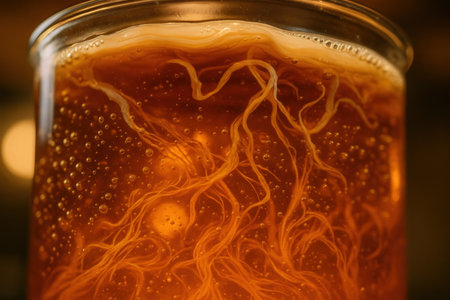 Bubbling Kombucha Fermentation With Tangled Cultures In Glass Jar