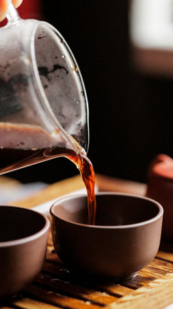 Pouring tea into elegant and beautifully designed cups set in a cozy and inviting environment