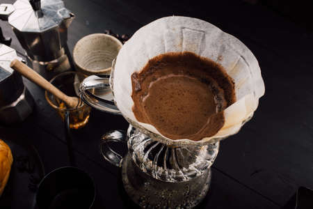 Coffee drip on the table, Drip brewing, filtered coffee, or pour-over is a method which involves pouring water over roasted, ground coffee beans contained in a filter. Breakfast concept.