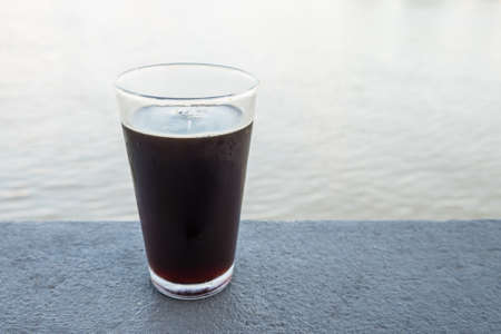 Glass of brown beer on a black background with copy space - Cold and refreshing alcoholic soft drink for summer