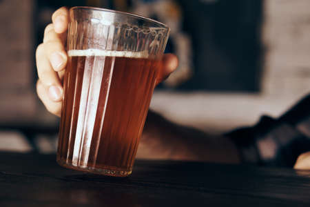 Glass pint of cold draft light lager or dark ale brewed beer with foam on table background. Brewery or pub bar advertising. Oktoberfest festival alcohol beverage or Saint Patricks day drink concept.
