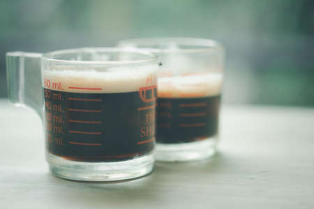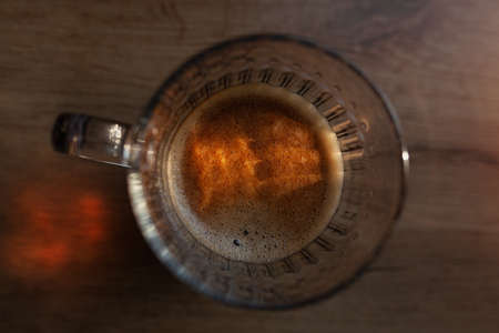 Espresso shot with aromatic crema foam on top, in glass cup on the wooden table with morning sunlight, top view