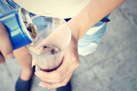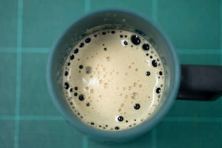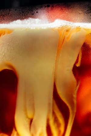 Cream being poured Into iced coffee. Macro shot, copy space.
