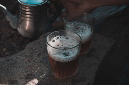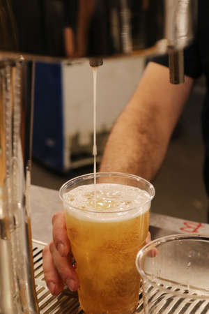 Asian friends Drinking beer outdoors at the brewery for the New Year festival