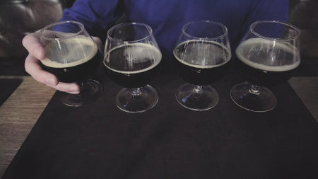 Four glasses of frothy drink on the bar table. Hand takes one of them. Beverage tasting concept
