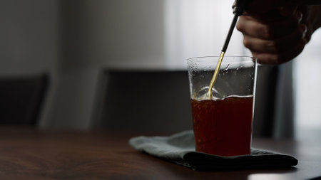 Hands of male barista pouring cold brew coffee into wine glass on coffee shop counter