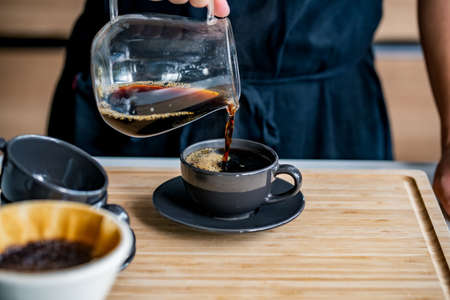 Close up. roasted coffee on coffee percolator with professional of a barista making coffee for dripping hot coffee into the cup with equipment, tool brewing at kitchen home