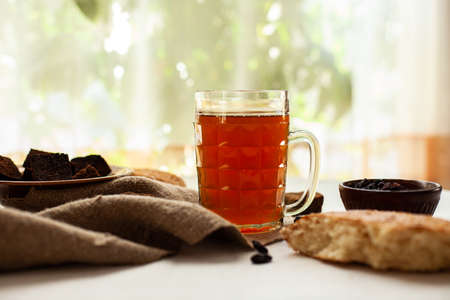 Homemade kvass in a large mug. A soft drink. A traditional Russian drink is kvass.