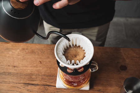 Man wearing a plaid shirt pouring water dripping hot coffee into the cup with equipment, tool brewing at kitchen home