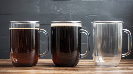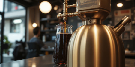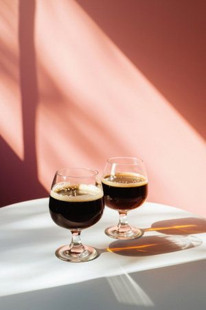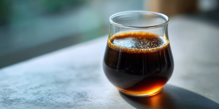 Cold brew coffee in curved tulip glass on table with soft natural light and warm atmosphere
