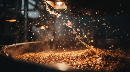 A stunning close-up of water splashing over grains in an industrial setting, capturing the texture and movement with dramatic light and droplets.