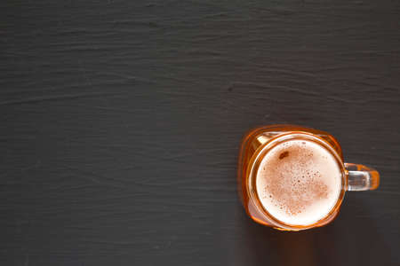 Hard Apple Cider Ale in a Glass Jar Mug on a black surface, top view. Flat lay, overhead, from above. Copy space.