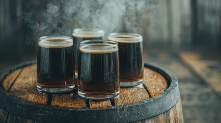 Four glasses of dark beer sit atop a wooden barrel, surrounded by a misty atmosphere, conveying a rustic and inviting brewery vibe.
